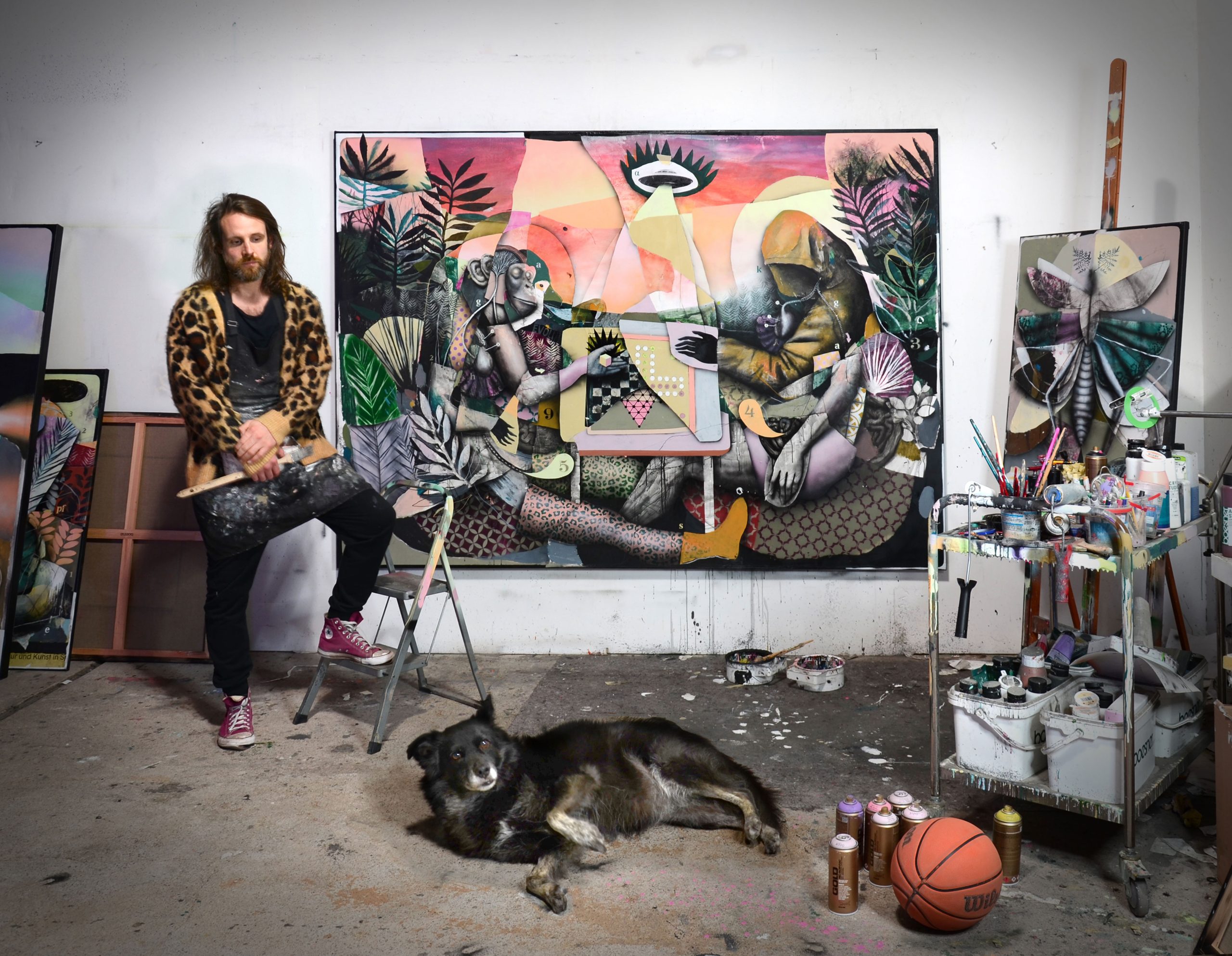 Seine Bildwelten verbinden figurative Darstellungen mit ornamentalen Mustern, Symbolen und ironischen Textfragmenten.